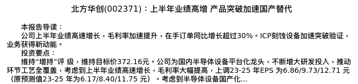 值得注意的是:2023年09月国泰君安的王聪/舒迪分析师,首次发布关于北方华创的研究报告,标题为:北方华创(002371):上半年业绩高增 产品突破加速国产替代。