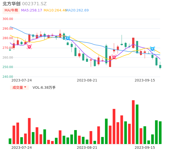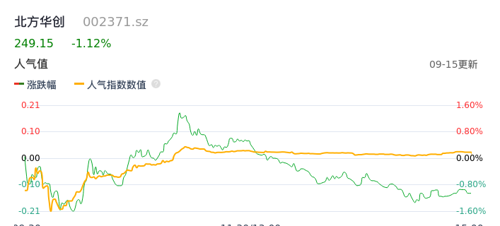 09月15日,北方华创收报249.15,股价涨幅-1.12%,成交金额16.01亿元,换手率1.21%。