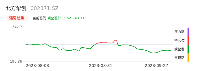 我们来看一下该股的九方特色指标强弱趋势的情况:北方华创自09月21日从支撑区回到观望区。股价前期快速下跌后经过中途弱势整理。目前短期处于弱势反弹迹象,后续重点关注能否站上多空分界点:248.31元。如未能有效突破则说明弱势反弹行情结束。后续可能再次进入空头行情。