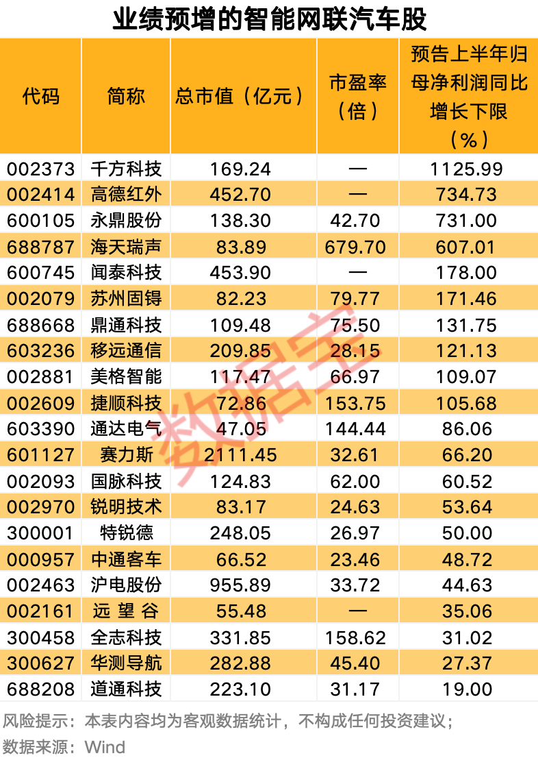 从业绩上来看,54只智能网联汽车概念股发布上半年业绩预告、业绩快报或半年报,以归母净利润同比增长下限来看,其中6股预告扭亏为盈,7股预告减亏,21股预告归母净利润同比增长,报喜比例超六成。