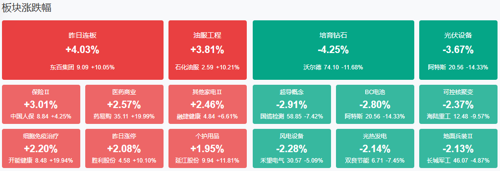板块方面,保险、医药、油气等板块涨幅居前,培育钻石、光伏、可控核聚变等板块跌幅居前。截至收盘,沪指跌0.07%,深成指跌0.36%,创业板指跌0.39%。