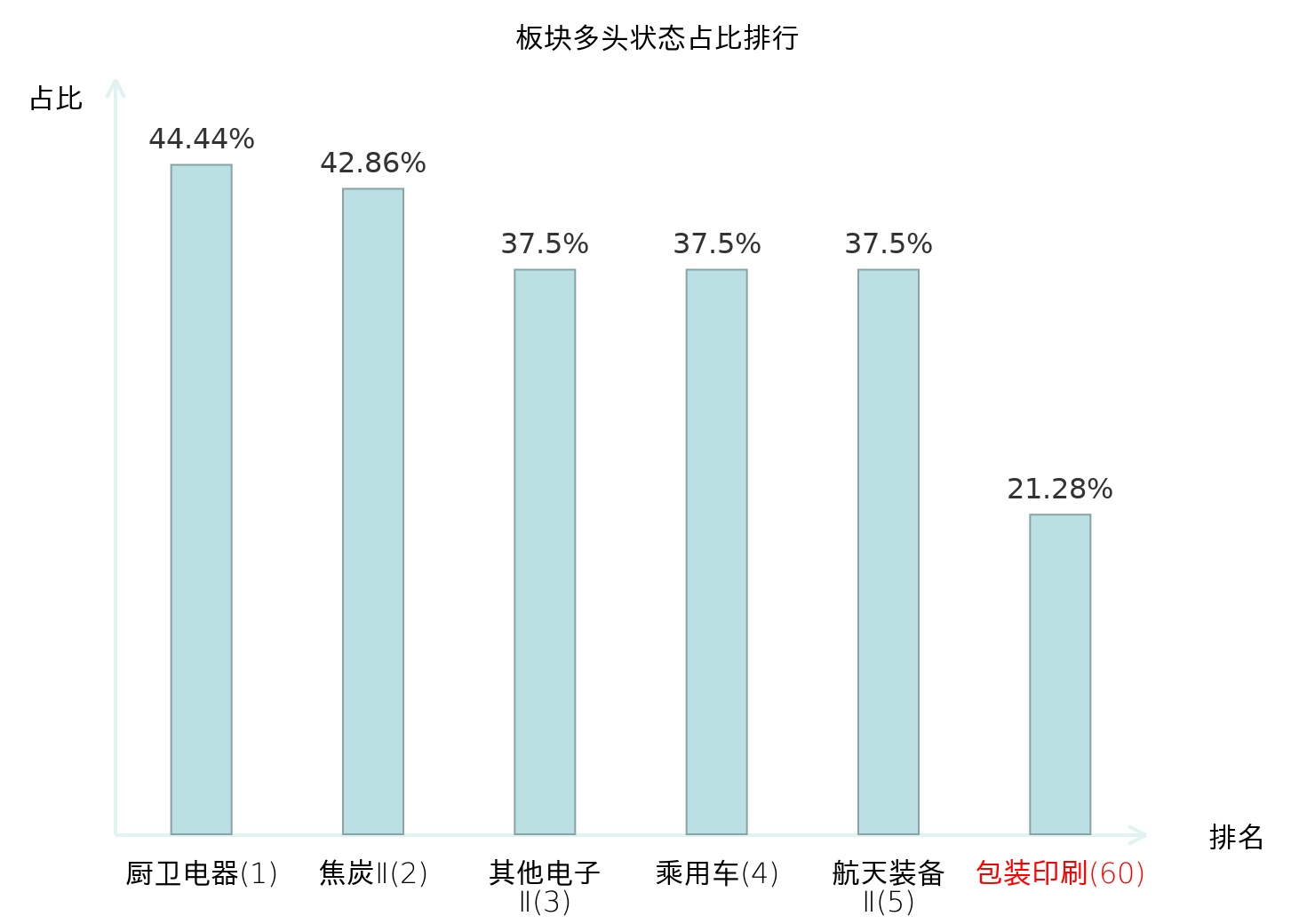 全市场所有行业板块中主力多头状态占比排名中,厨卫电器板块位居第一。元件板块名次提升最快,较昨日上升69位。