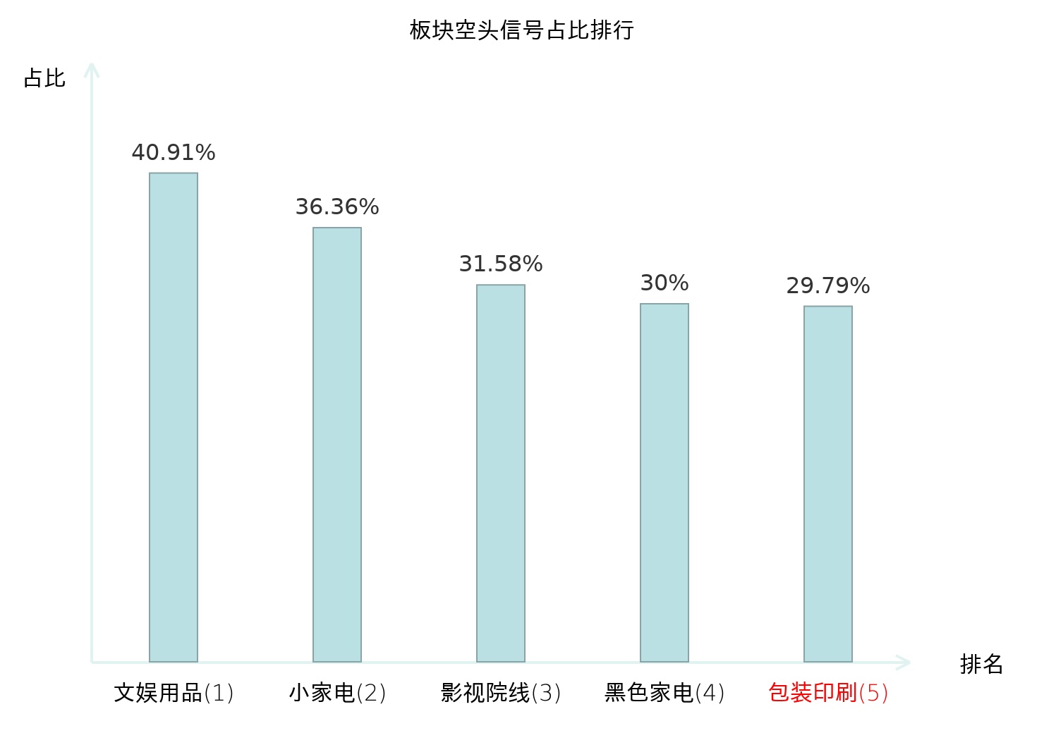 全市场所有行业板块中主力空头信号占比排名中,文娱用品板块位居第一。包装印刷板块名次提升最快,较昨日上升124位。