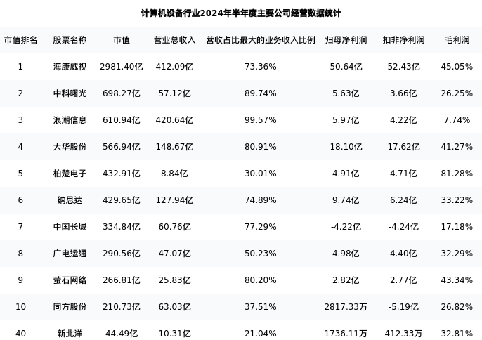 新北洋最新报告期数据为半年度,下表汇总了计算机设备行业内市值靠前的公司半年度主要经营数据