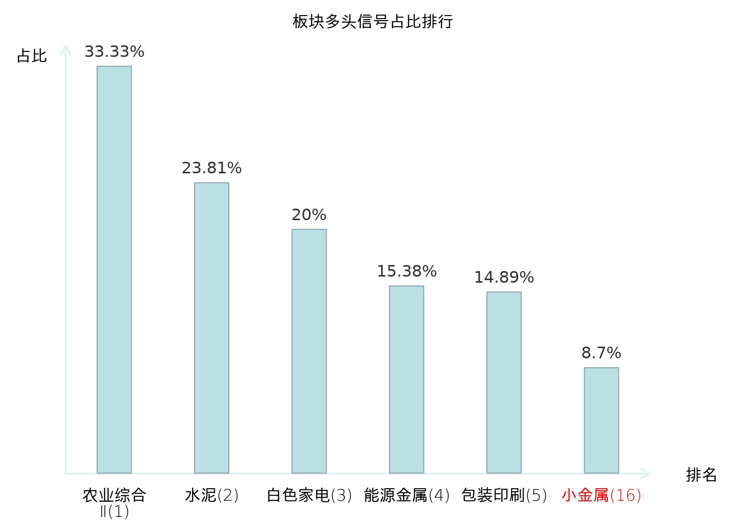 全市场所有行业板块中主力多头信号占比排名中,农业综合Ⅱ板块位居第一。农业综合Ⅱ板块名次提升最快,较昨日上升127位。