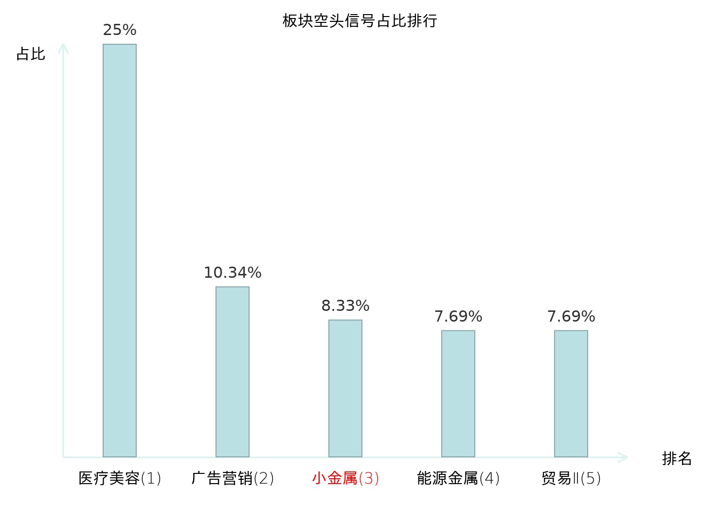 全市场所有行业板块中主力空头信号占比排名中,医疗美容板块位居第一。广告营销板块名次提升最快,较昨日上升113位。