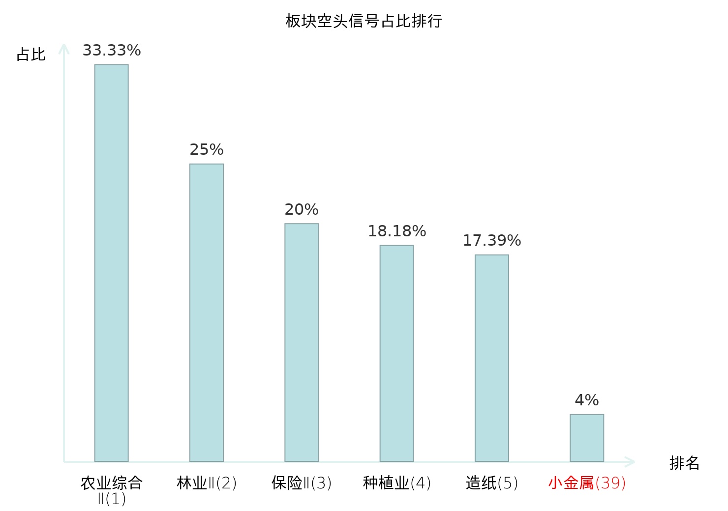 全市场所有行业板块中主力空头信号占比排名中,农业综合Ⅱ板块位居第一。炼化及贸易板块名次提升最快,较昨日上升115位。