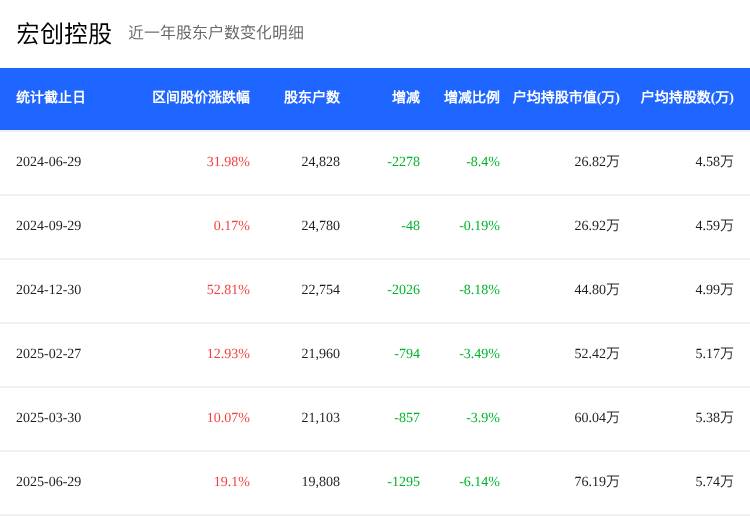 宏创控股(002379)在2025年第二季度末的股东户数为1.98万户,较上一季度减少了6.14%。户均持股数量为6.54万股,环比增加了26.89%。户均持股市值为76.19万元,环比增长了26.89%。