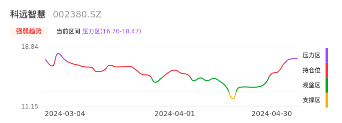 我们来看一下该股的九方特色指标强弱趋势的情况:科远智慧近日从持仓区进入压力区。股价出现一波快速拉升行情,目前上升动能较为充足可继续持股。注意今日上方压力位:18.47元是否能有效突破。