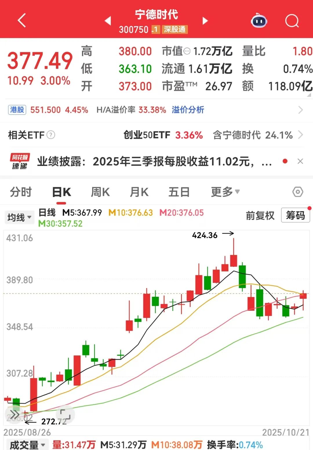 受业绩大增影响,10月21日早盘,宁德时代开盘上涨1.77%,早盘收涨3%。
