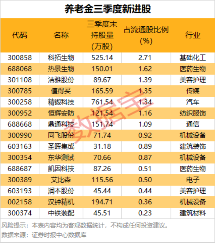 新进股中,养老金账户持股比例最多的是科拓生物,持股比例为2.71%,热景生物、洁雅股份等持股比例居前。