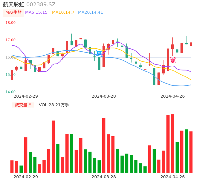 04月26日,航天彩虹收报16.85,股价涨幅0.54%,成交金额4.77亿元,换手率2.85%。