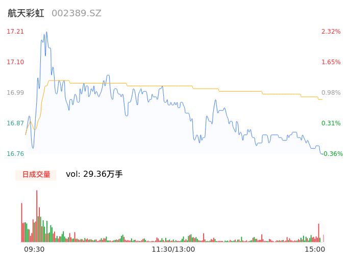 04月25日,航天彩虹收报16.76,股价涨幅-0.36%,成交金额4.98亿元,换手率2.96%。