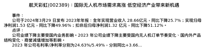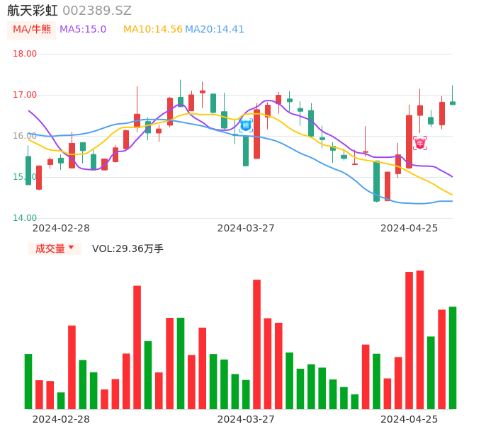 值得注意的是:2024年04月东北证券的王凤华/王璐分析师,首次发布关于航天彩虹的研究报告,标题为:航天彩虹(002389):国际无人机市场需求高涨 低空经济产业带来新机遇。