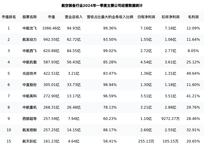 航天彩虹最新报告期数据为一季度,下表汇总了航空装备行业内市值靠前的公司一季度主要经营数据