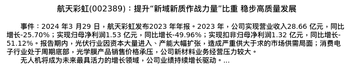 值得注意的是:2024年04月长城证券的付浩/于夕朦/孙培德分析师,首次发布关于航天彩虹的研究报告,标题为:航天彩虹(002389):提升“新域新质作战力量”比重 稳步高质量发展。
