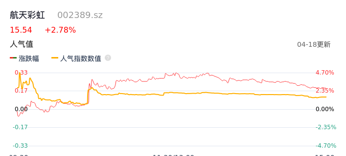 04月18日,航天彩虹收报15.54,股价涨幅2.78%,成交金额2.70亿元,换手率1.76%。
