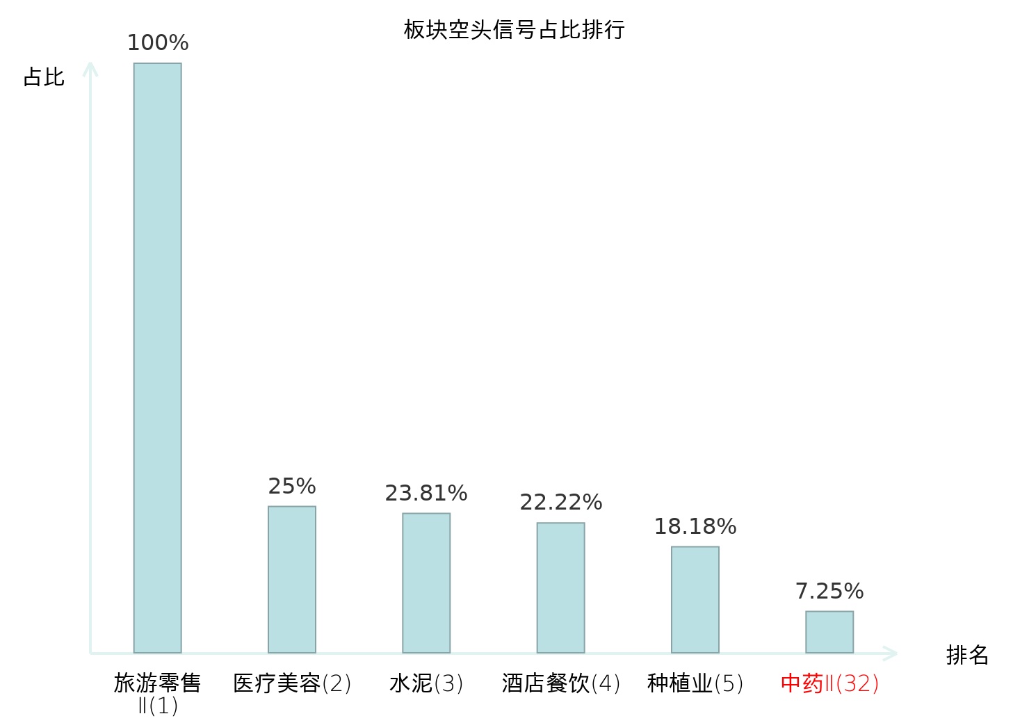 全市场所有行业板块中主力空头信号占比排名中,旅游零售Ⅱ板块位居第一。装修建材板块名次提升最快,较昨日上升112位。