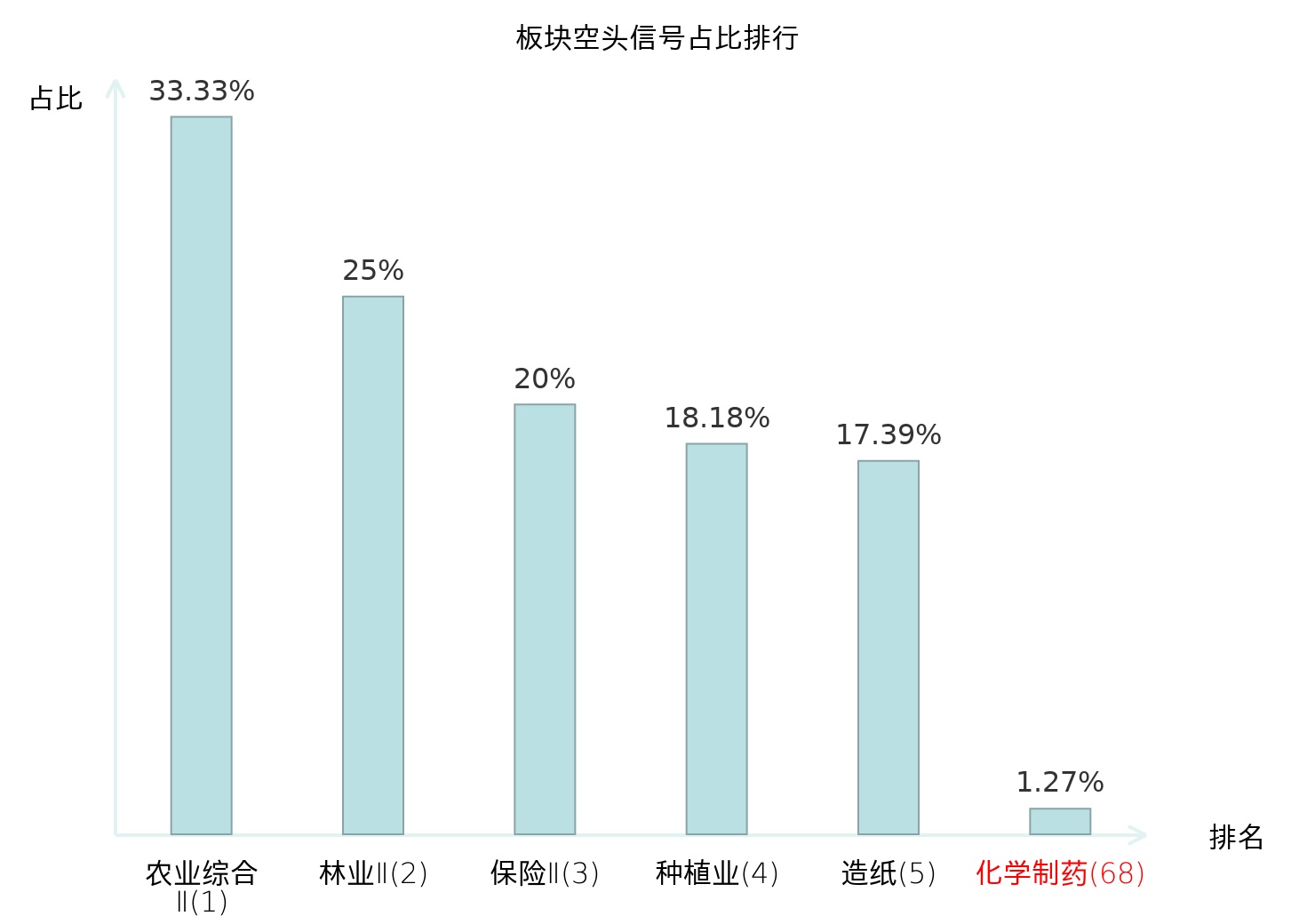 全市场所有行业板块中主力空头信号占比排名中,农业综合Ⅱ板块位居第一。炼化及贸易板块名次提升最快,较昨日上升115位。