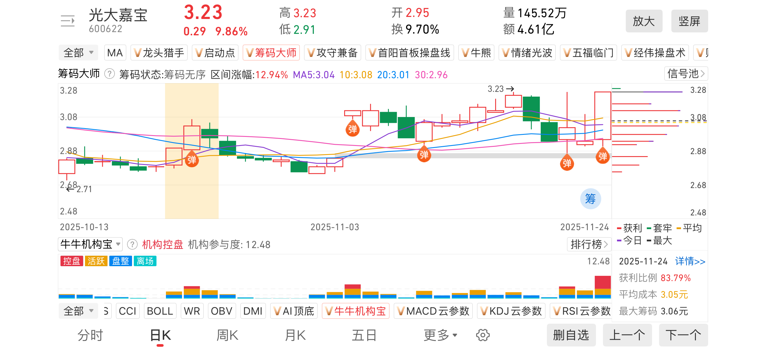 2)20251124-光大嘉宝-600622-【筹码大师】和【牛牛机构宝】-近期出现弹信号且底部量柱由绿转红