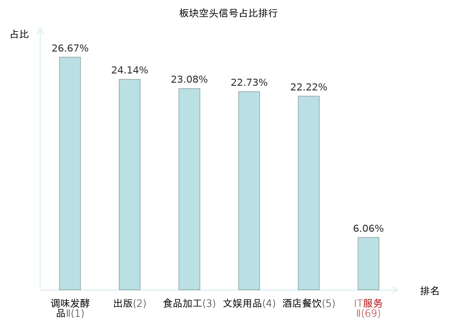 全市场所有行业板块中主力空头信号占比排名中,调味发酵品Ⅱ板块位居第一。中药Ⅱ板块名次提升最快,较昨日上升110位。