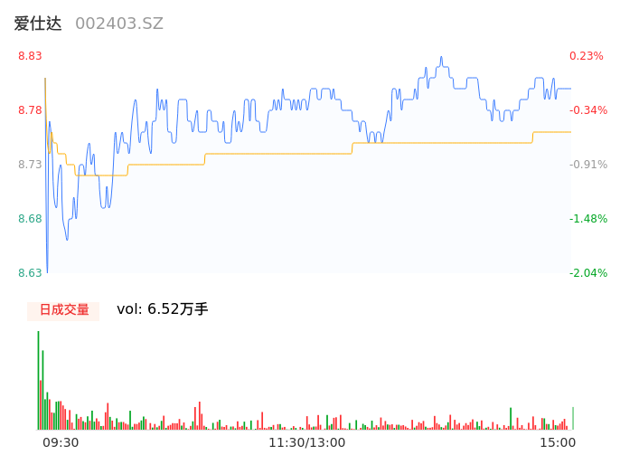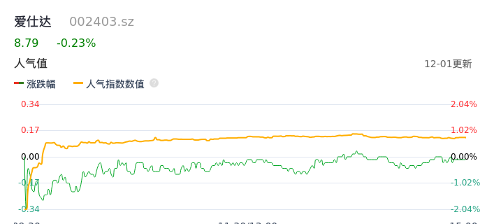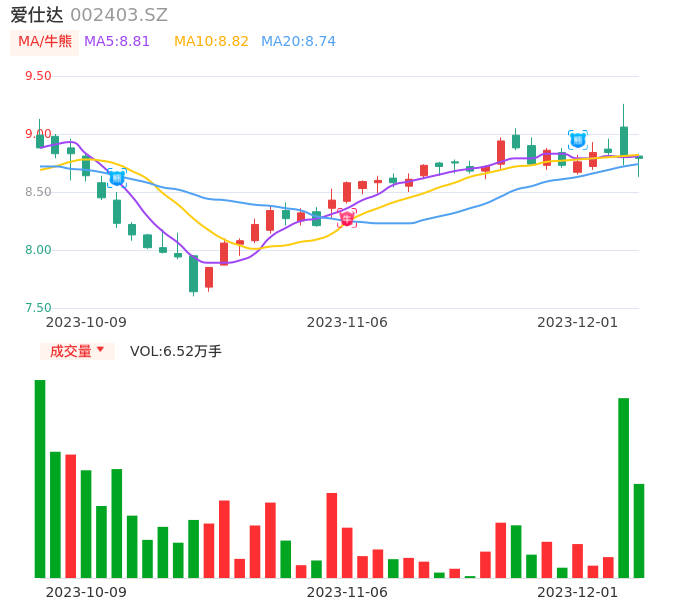 12月01日,爱仕达收报8.79,股价涨幅-0.23%,成交金额5713.68万元,换手率2.13%。