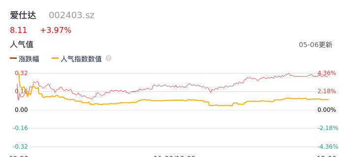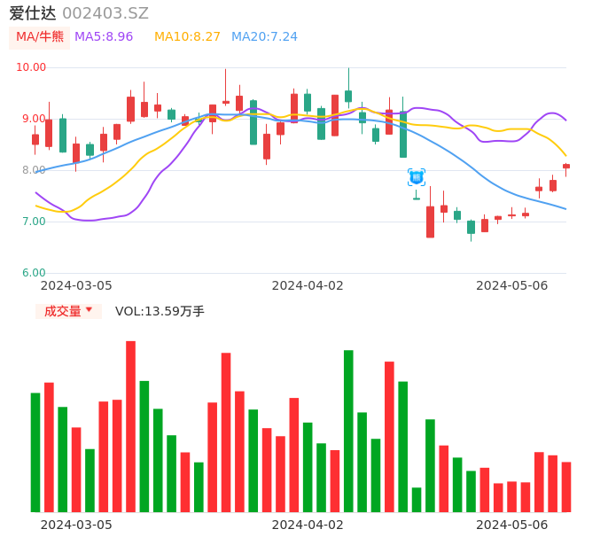 05月06日,爱仕达收报8.11,股价涨幅3.97%,成交金额1.09亿元,换手率4.44%。