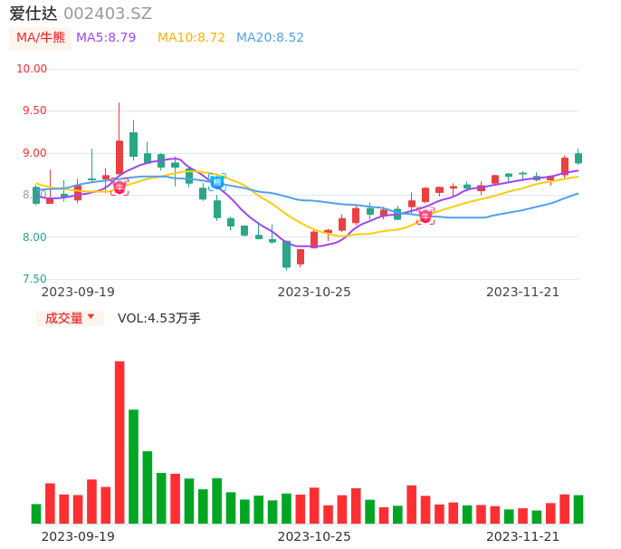 11月21日,爱仕达收报8.88,股价涨幅-0.67%,成交金额4057.05万元,换手率1.48%。