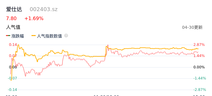 04月30日,爱仕达收报7.80,股价涨幅1.69%,成交金额1.19亿元,换手率5.04%。
