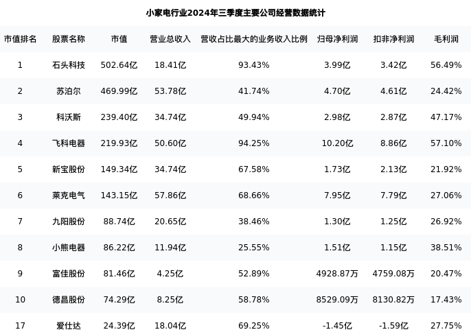 爱仕达最新报告期数据为三季度,下表汇总了小家电行业内市值靠前的公司三季度主要经营数据
