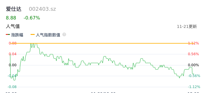 11月21日,爱仕达收报8.88,股价涨幅-0.67%,成交金额4057.05万元,换手率1.48%。