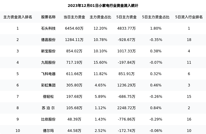 从主力资金流向来看,小家电行业今日主力资金流入3.95亿元,在所有申万二级行业中排名:102/131。