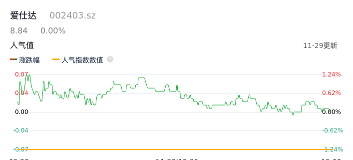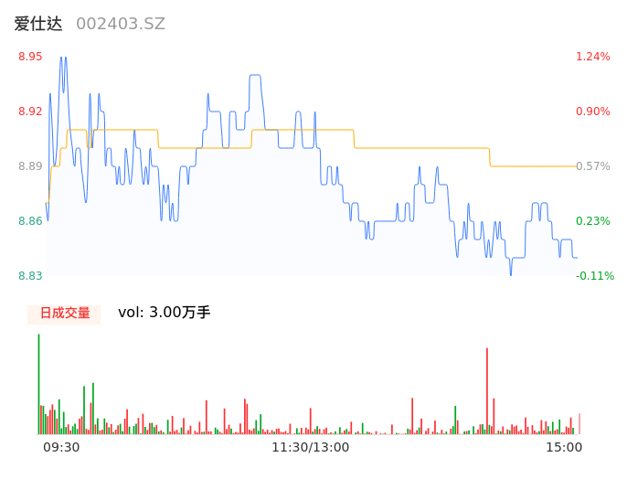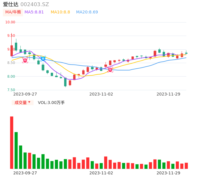 11月29日,爱仕达收报8.84,股价涨幅0.00%,成交金额2669.87万元,换手率0.98%。