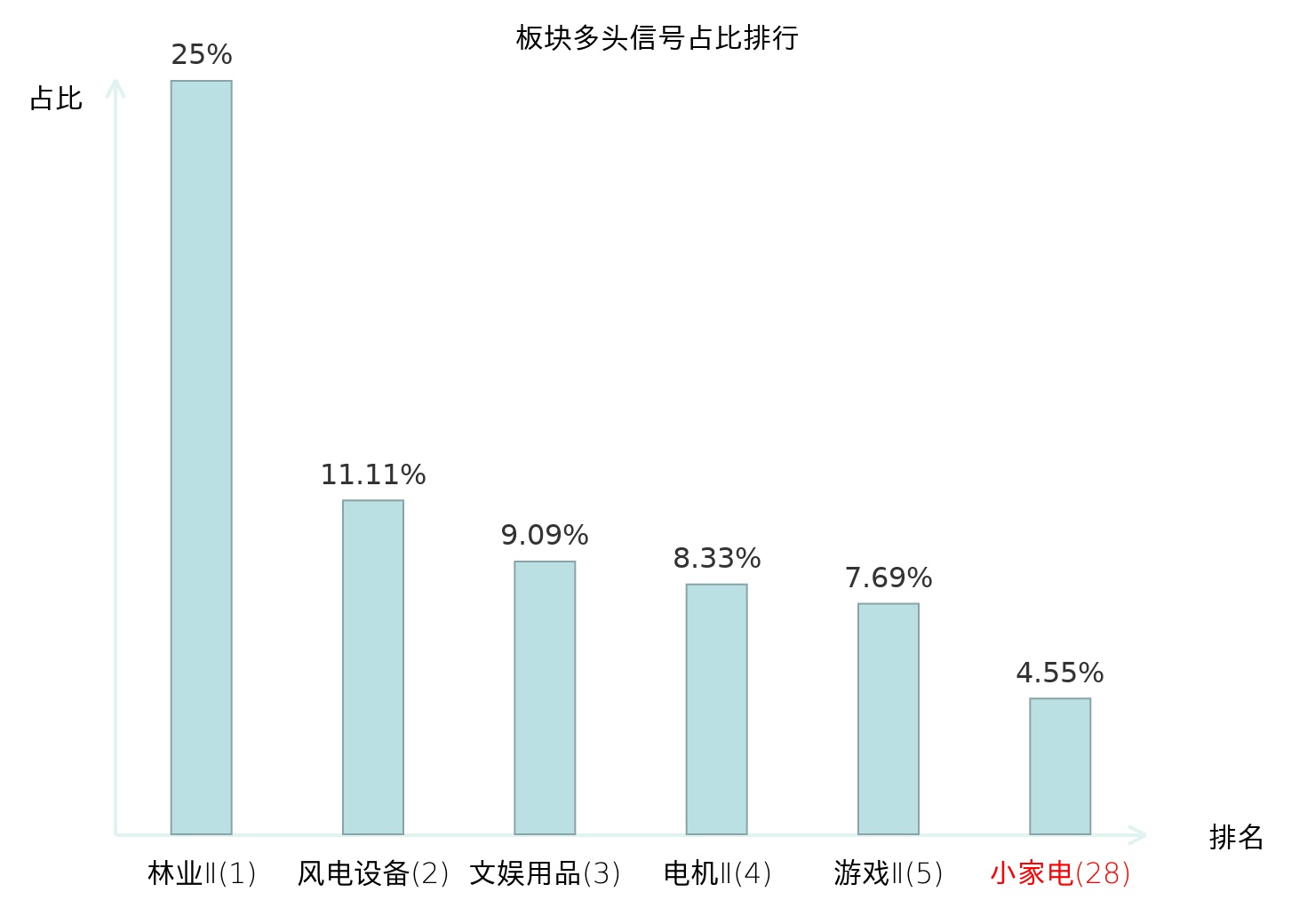 全市场所有行业板块中主力多头信号占比排名中,林业Ⅱ板块位居第一。林业Ⅱ板块名次提升最快,较昨日上升124位。