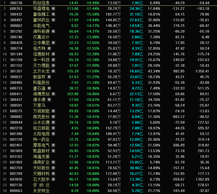 新能源产业链下午持续走低,也没有像样的一个趋势股带头,也就注定了今天尾盘锂电资源这块没有明显的抢反弹资金(甚至几个重要的趋势中军都是遭遇机构资金猛砸的,天赐2家机构砸了快4个亿,多氟多2家机构席位也是净卖出1.73亿元、石大胜华、天际股份跌停,资金也都是净流出的)。锂电今天在跌幅榜中占据大半壁江山,资金高位兑现猛如虎,这里把握难度很大,适合有底舱的朋友做交易,没有的朋友尽量多看少动吧,或者多留意消息面的动向。