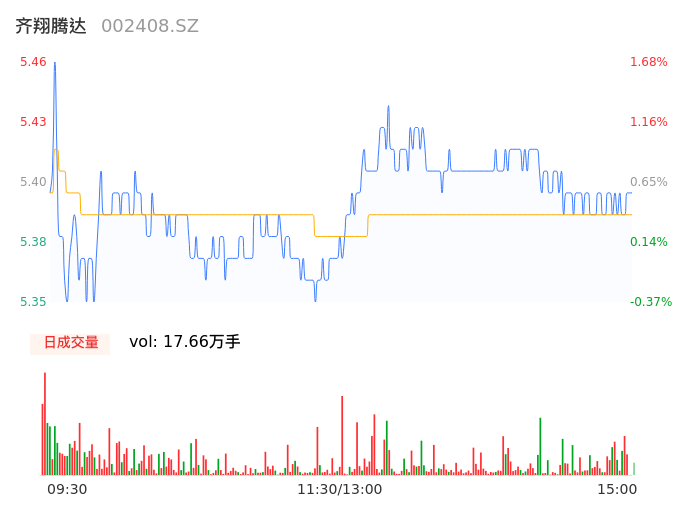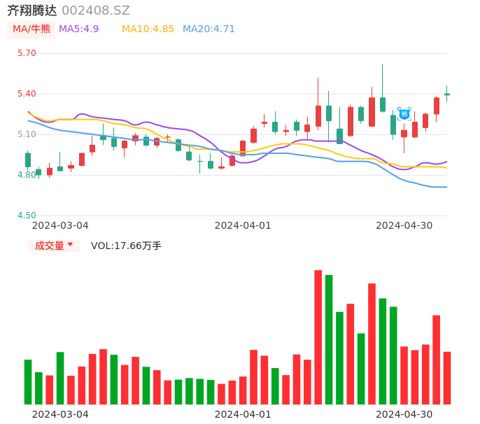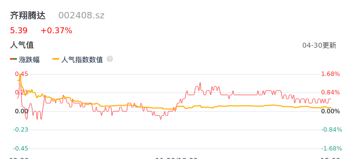 04月30日,齐翔腾达收报5.39,股价涨幅0.37%,成交金额9528.33万元,换手率0.64%。