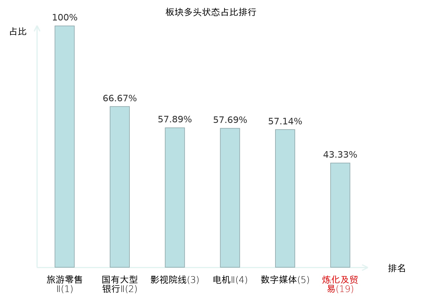 全市场所有行业板块中主力多头状态占比排名中,旅游零售Ⅱ板块位居第一。专业连锁Ⅱ板块名次提升最快,较昨日上升56位。