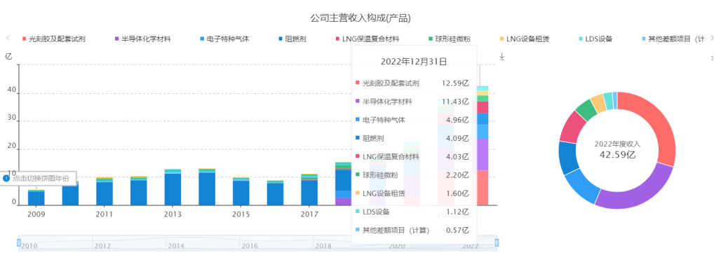 公司电子特气业务,实现营收5个亿,占比11.64%,2017年雅克科技收购成都科美特,业务拓展至含氟电子特气领域。目前公司已有六氟化硫10000吨和四氟化碳2000吨产能。扩产方面,2022年3月年产12000吨电子级六氟化硫和年产2000吨半导体用电子级四氟化碳生产线技改项目已达到预定可使用状态,六氟化硫和四氟化碳产能分别增加3500吨和800吨。