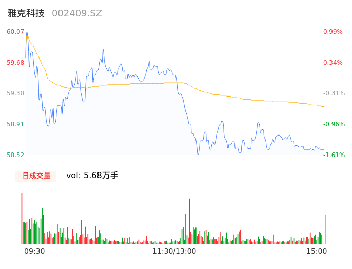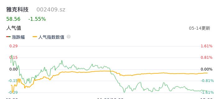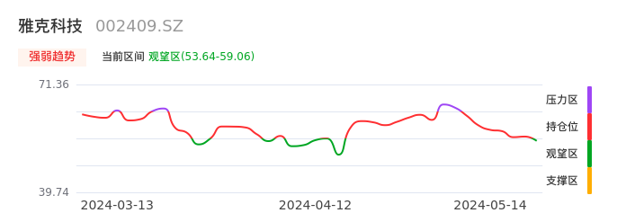 05月14日,雅克科技收报58.56,股价涨幅-1.55%,成交金额3.36亿元,换手率1.78%。
