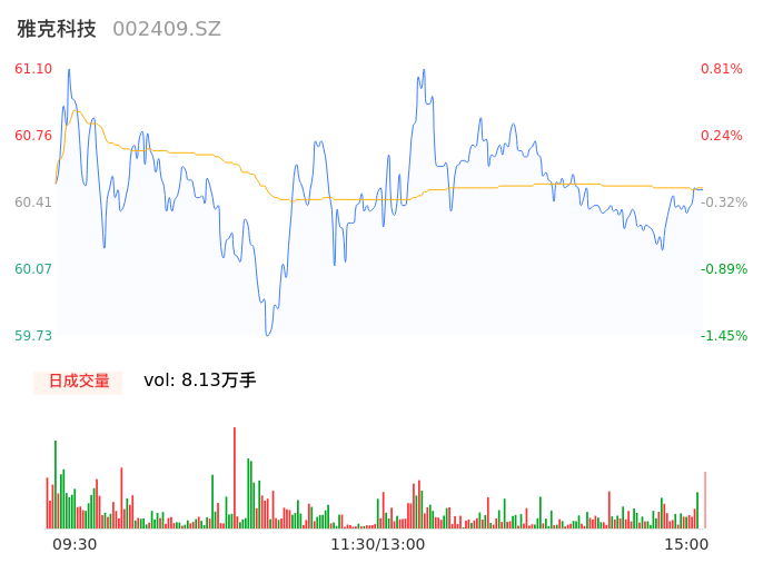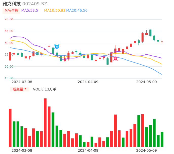05月09日,雅克科技收报60.52,股价涨幅-0.15%,成交金额4.92亿元,换手率2.55%。