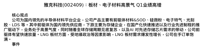 值得注意的是:2024年05月中信建投证券的卢昊分析师,首次发布关于雅克科技的研究报告,标题为:雅克科技(002409):板材、电子材料高景气 Q1业绩高增。