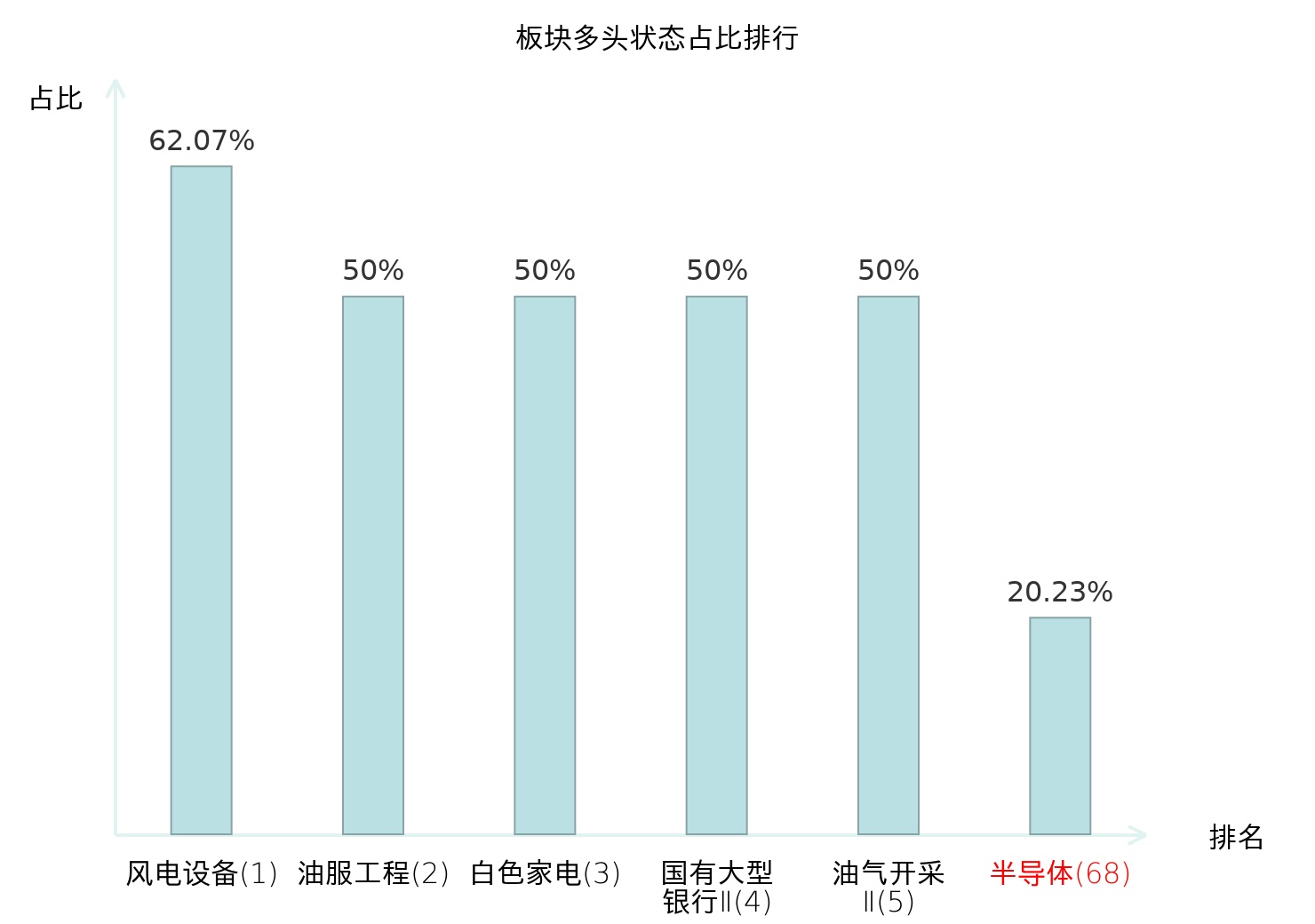 全市场所有行业板块中主力多头状态占比排名中,风电设备板块位居第一。动物保健Ⅱ板块名次提升最快,较昨日上升64位。