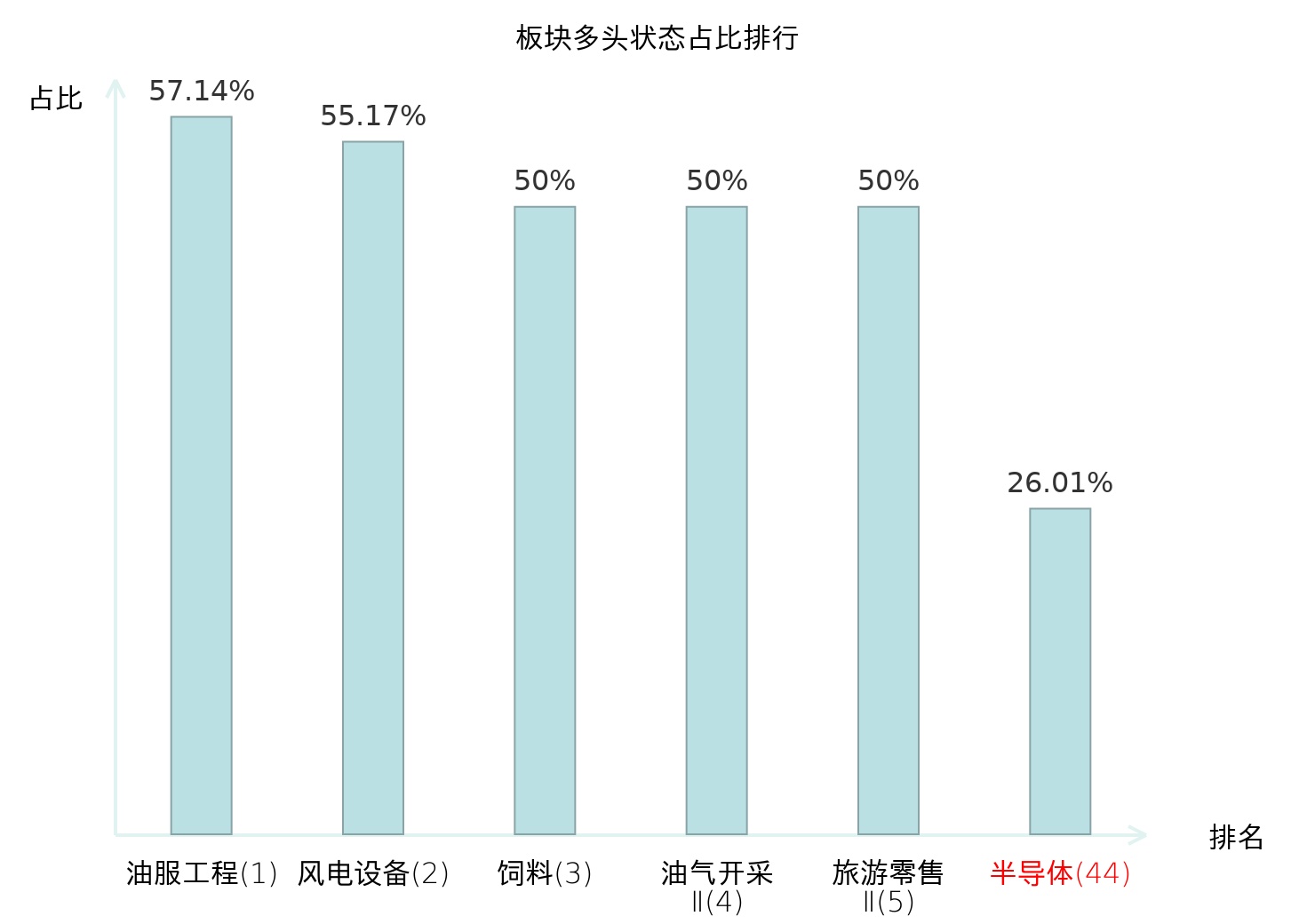 全市场所有行业板块中主力多头状态占比排名中,油服工程板块位居第一。非金属材料Ⅱ板块名次提升最快,较昨日上升67位。