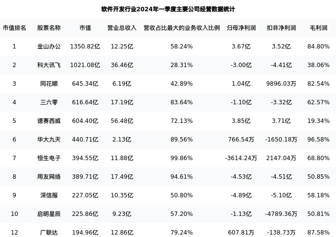 广联达最新报告期数据为一季度,下表汇总了软件开发行业内市值靠前的公司一季度主要经营数据