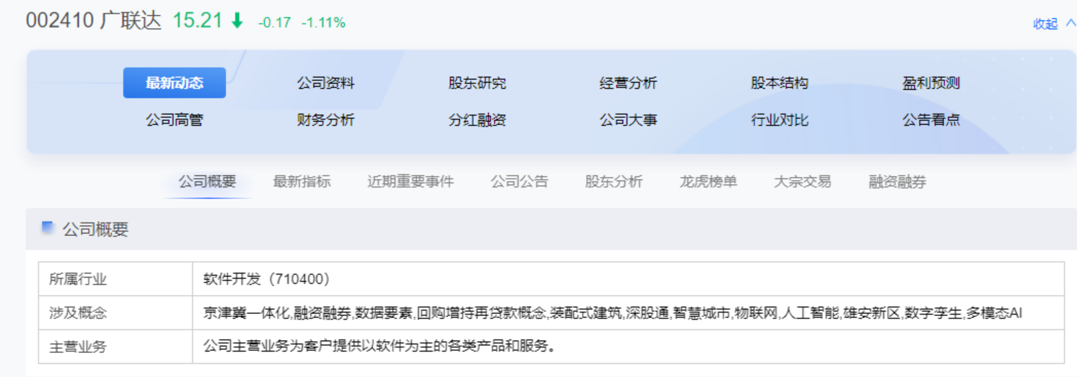 今天为大家带来的是广联达,我们先来了解一下这家公司是做什么的,我们通过公司概要可以清楚的看到:公司所属行业是软件开发。
