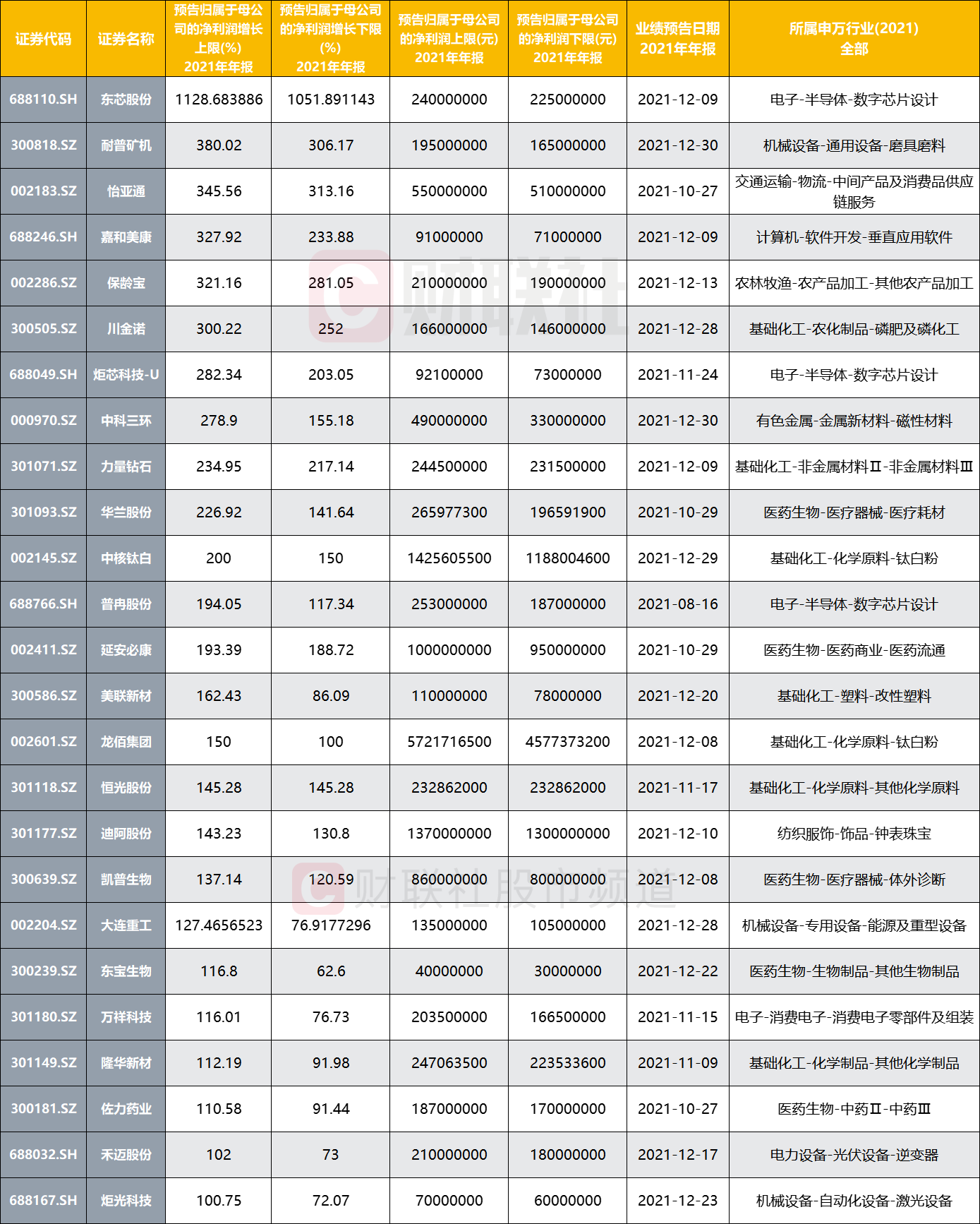 从年报业绩预告的同比值来看,共有25家上市公司全年归母净利润增长(上限)逾一倍,其中,12月于科创板上市东芯股份表现最佳,公司预计2021年归母净利润2.25亿元至2.4亿元,同比增长10.52倍至11.29倍。耐普矿机、怡亚通、嘉和美康、保龄宝、川金诺增幅逾3倍,炬芯科技、中科三环、力量钻石、华兰股份、中核钛白增幅逾2倍,普冉股份、延安必康、美联新材等14股增幅过一倍。