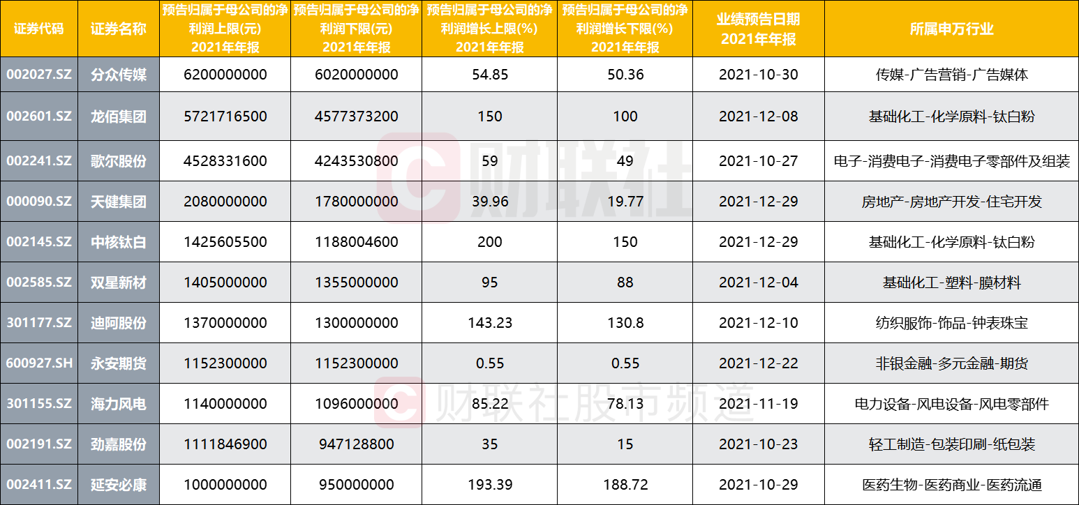 在目前已经披露年报预告的105家上市公司中,预计归属于上市公司股东的净利润(上限)逾10亿元的个股共有12家,分别为分众传媒、龙佰集团、歌尔股份、天健集团、双星新材、迪阿股份、中核钛白、永安期货、海力风电、延安必康、劲嘉股份。从板块来看,其中3股属于基础化工行业,为钛白粉和膜材料概念,其余个股涵盖传媒、电子、地产、纺织、期货、风电设备、包装、医药行业。