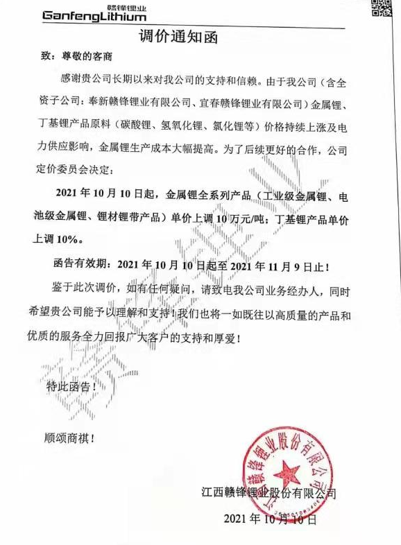 赣锋锂业表示,调价原因系原料价格持续上涨及电力供应影响,金属锂生产成本大幅提高所致。