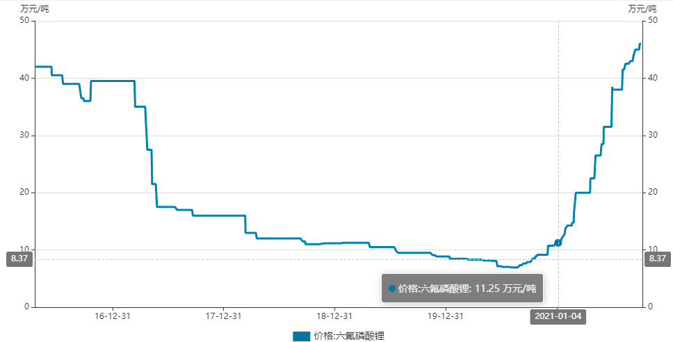 六氟磷酸锂的价格从年初的11.25万元/吨涨至当前的46万元/吨,年上涨幅度超3倍。据高工锂电估计,2021年全球六氟磷酸锂将出现供需缺口,供给量和需求量预计分别为5.9万吨和6.35万吨。由于扩产周期较长,行业新增供给需要1.5-2年,释放时间较长,预计六氟磷酸锂的价格到明年一季度还将维持高位,供需关系依然偏紧。
