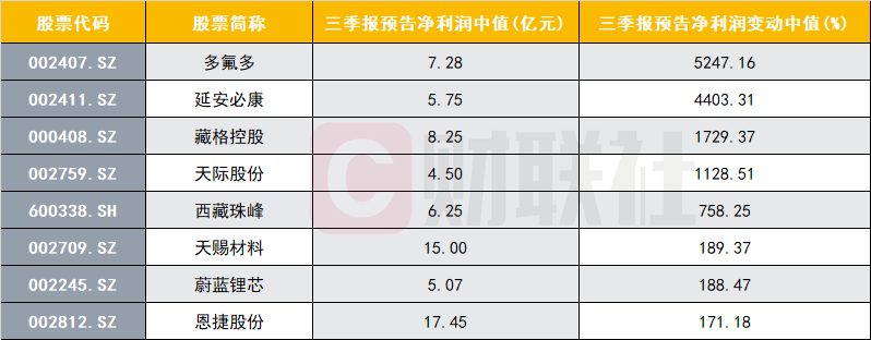 此外,已公布的三季报业绩预告中,藏格控股、天际股份业绩预增幅度均超过10倍。
